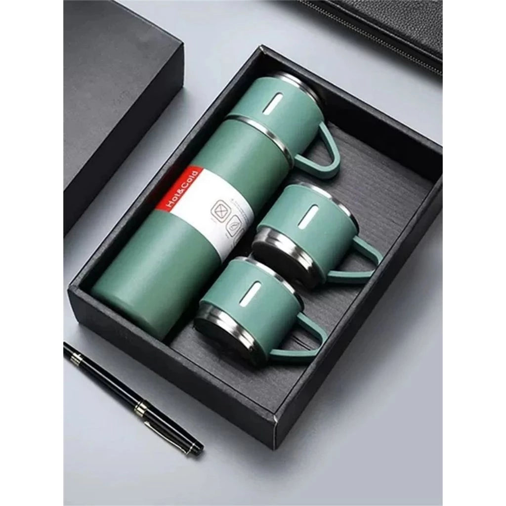 Kit Garrafa Térmica Vacuum Bottle Inox 500ml + 3 Xícaras – Para Bebidas Quentes ou Frias