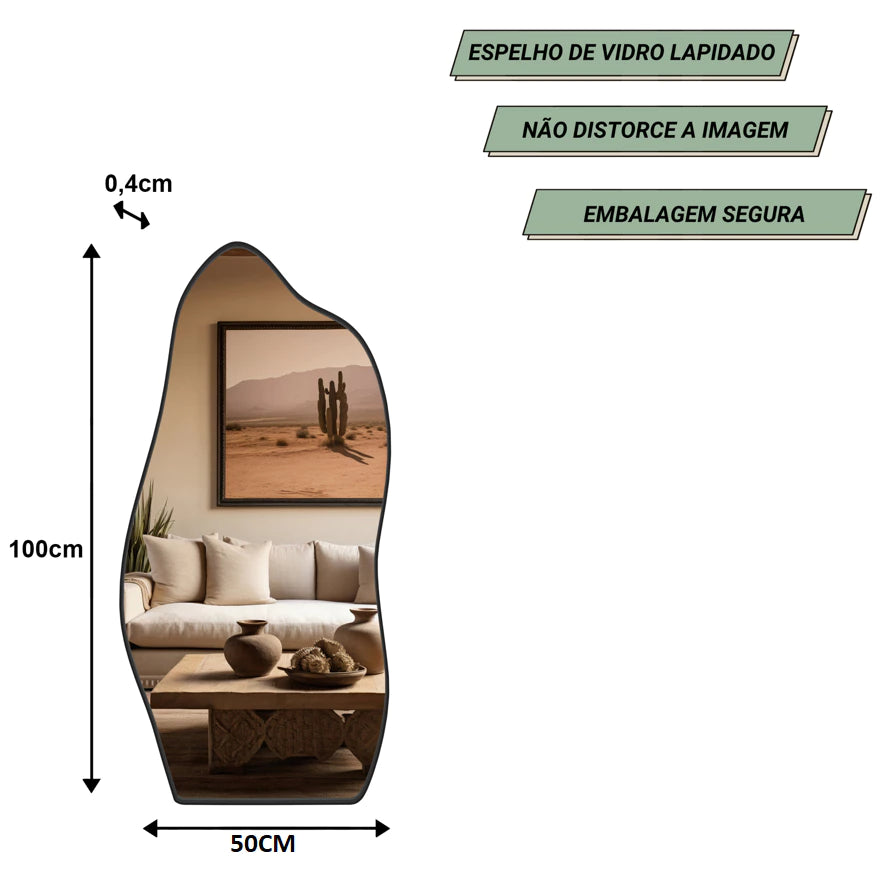 O Espelho Orgânico 100x50 Luxo é mais que um espelho – é uma peça de design escultural que traz personalidade e elegância para qualquer ambiente. Com formas fluídas e contorno orgânico, ele cria movimento visual e sofisticação contemporânea. Seu tamanho grande é ideal para reflexo de corpo inteiro, valorizando desde halls de entrada até closets, quartos e salas de estar.