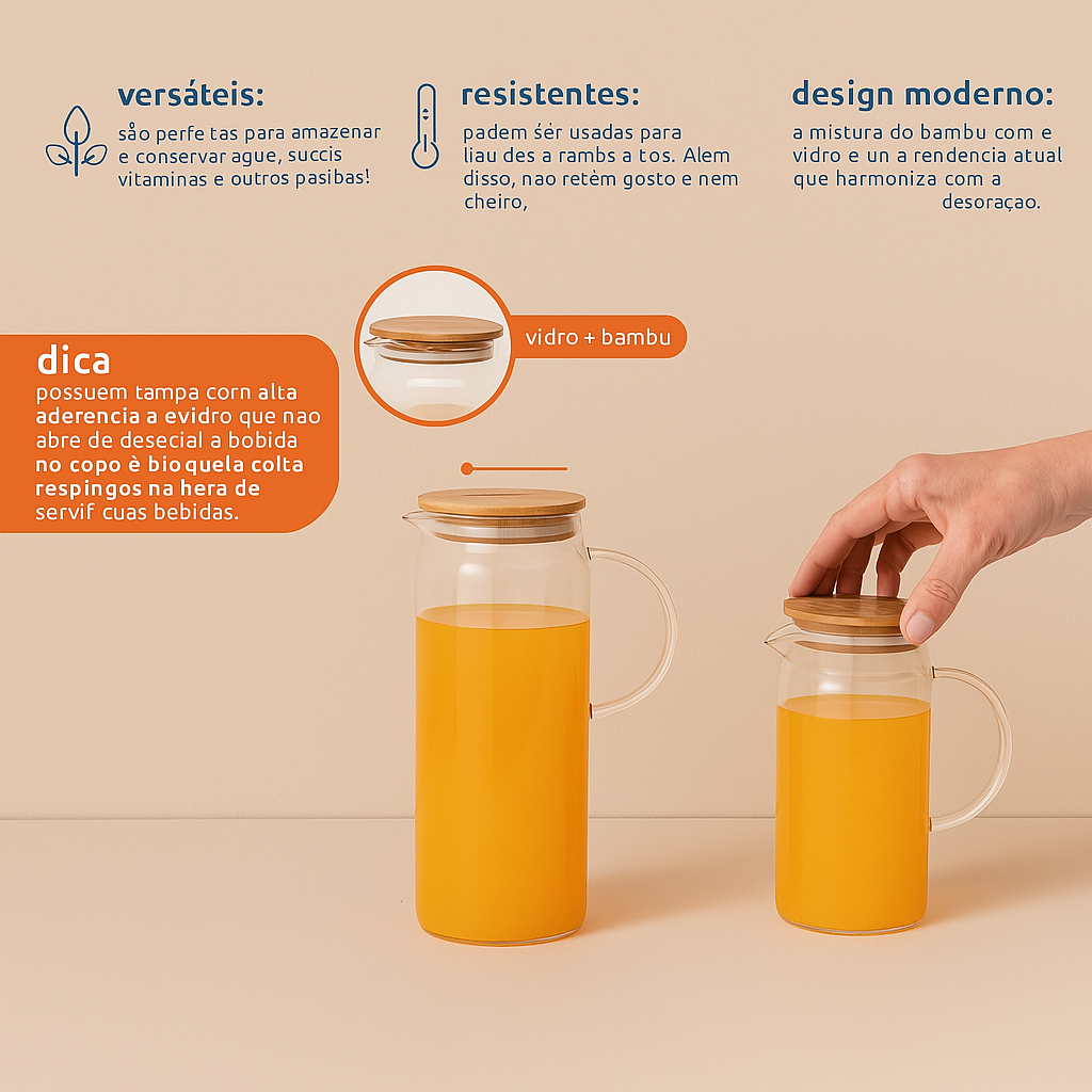 Feitas para durar, as jarras de vidro borossilicato são resistentes a manchas e odores, garantindo que suas bebidas mantenham sempre o sabor original. A tampa de bambu, além de ecológica, impede a entrada de poeira e conserva melhor as propriedades das bebidas. Opte por uma escolha consciente de um estilo de vida sustentável e duradouro.