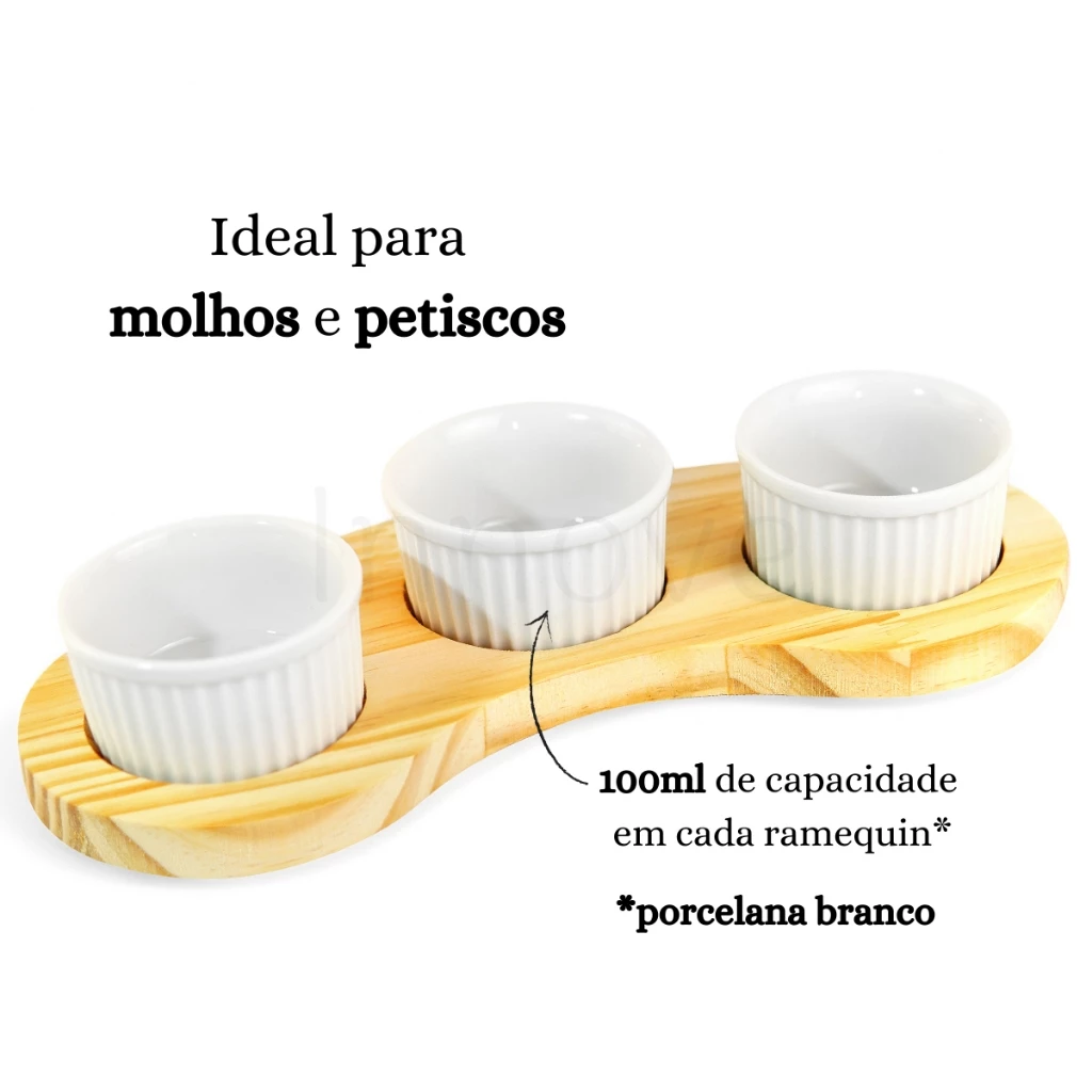 Os ramequins de porcelana média possuem acabamento brilhante, são resistentes ao calor e podem ir ao forno, micro-ondas e lava-louças — praticidade que se une ao bom gosto. Já a tábua de madeira pinus, além de sustentável, é leve, resistente e conta com acabamento liso e corte ergonômico que facilita o transporte e a disposição à mesa. Um conjunto feito para durar, decorar e encantar.