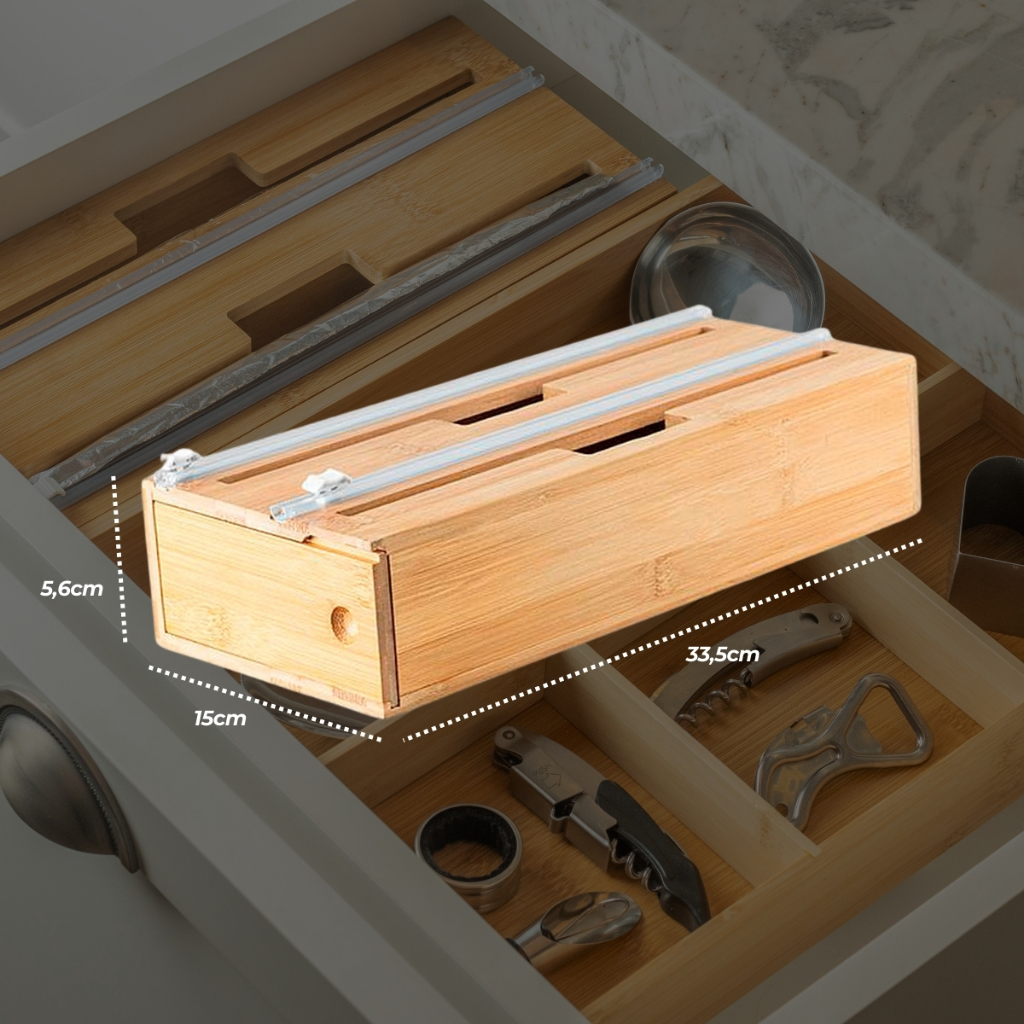 Este organizador de bambu vai além da estética: ele se adapta a diferentes tamanhos de rolos e permite que você personalize o uso conforme suas necessidades. Seja para filmes plásticos, alumínio ou outros tipos de embalagem, o organizador acomoda todos com facilidade, mantendo a cozinha limpa e organizada.