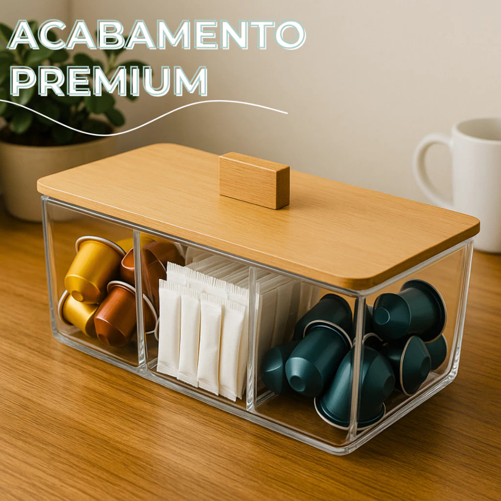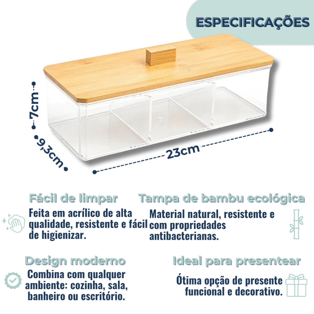 Com 3 divisórias internas, essa caixa é perfeita para armazenar sachês de chá, joias, acessórios delicados ou temperos gourmet. O tamanho compacto facilita o uso em bandejas, gavetas ou prateleiras, sem ocupar espaço desnecessário.