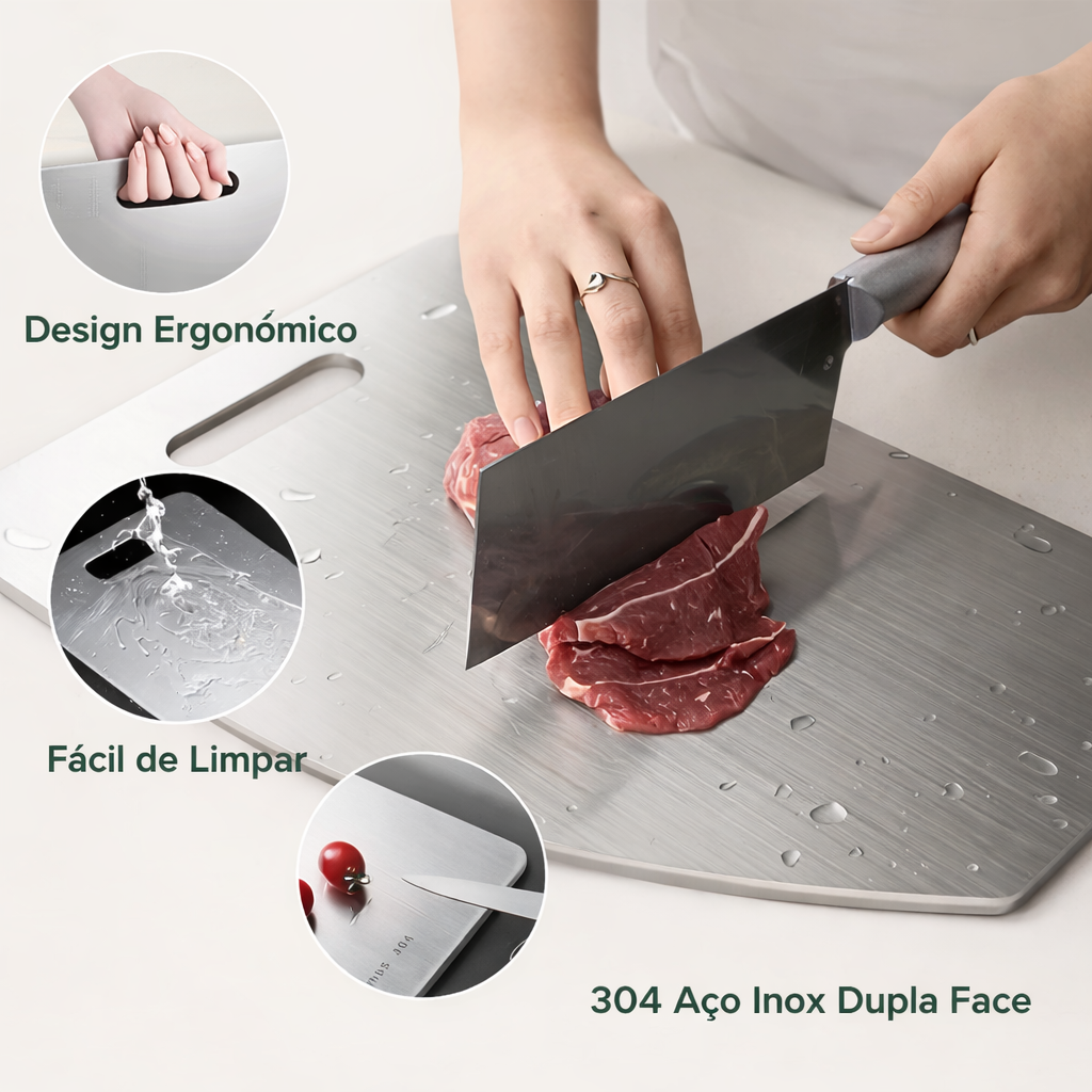 A Tábua de Corte em Aço Inox 304 une tecnologia, higiene e moda — um item essencial para elevar o padrão de sua cozinha.
