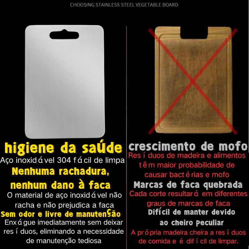 A Tábua de Corte em Aço Inoxidável 304 é a escolha ideal para quem prioriza segurança alimentar e higiene absoluta na cozinha. Diferente das tábuas comuns, sua superfície não absorve líquidos, odores ou resíduos , sendo antibacteriana e à prova de mofo , perfeita para o preparo de carnes, legumes, frutas e peixes